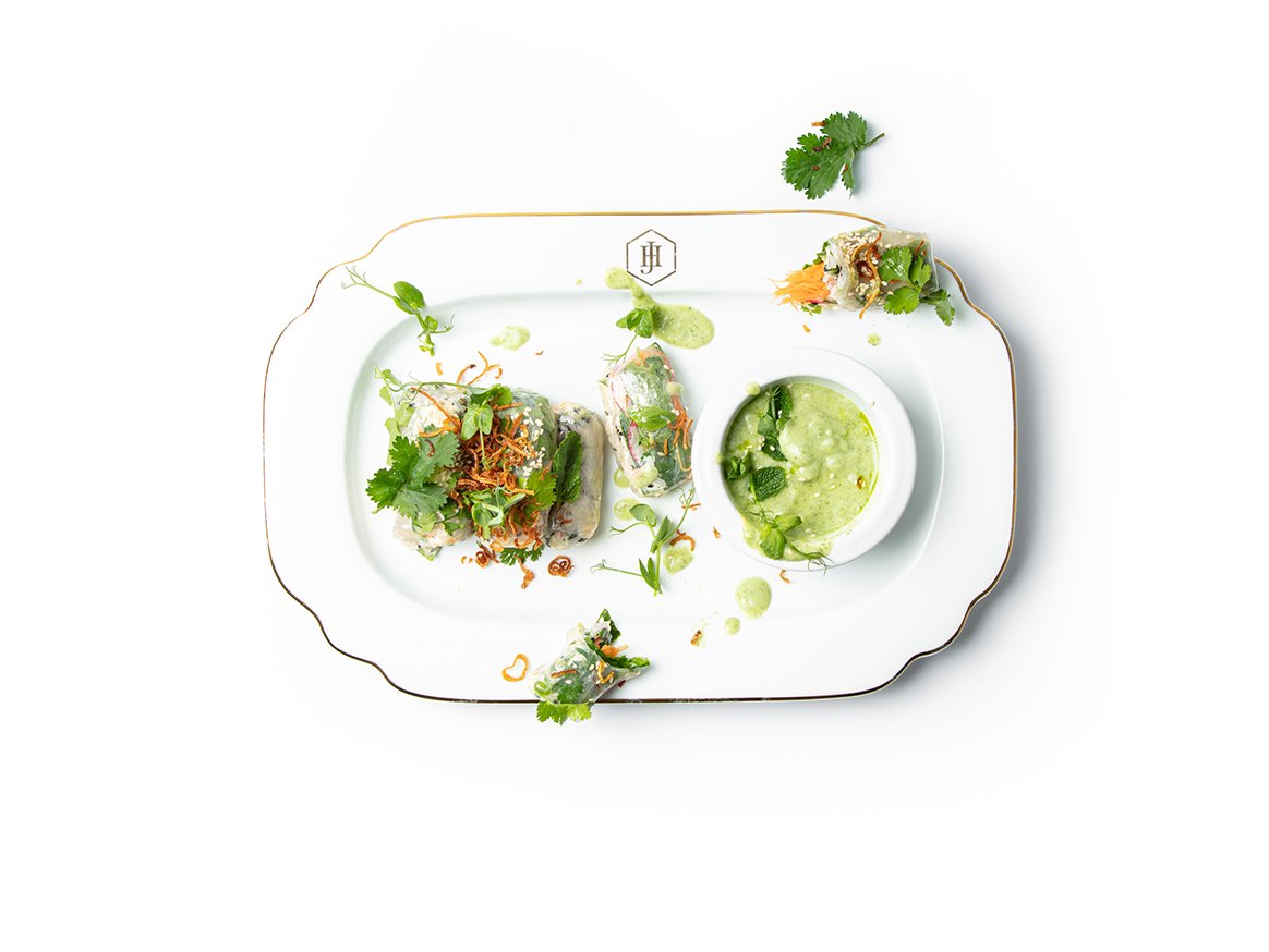 Pour 500 ml water in a pan and heat to just before boiling. Remove from the heat and carefully dip on rice paper in the water for 5 seconds. Take out and place flat on your work surface. Repeat with four more wrappers. Place a teaspoon of rice in the centre of a wrapper and top with cucumber ribbons, sliced radishes, pickled carrots, basil, mint and coriander. Fold one part of the rice paper wrapper over the length of the filling. Then, fold the two opposite edges of the wrapper over the width of the filling. Continue to roll the wrapper until closed. Brush with a little sesame oil and place on a serving plate. Repeat this process with the rest of the dipped wrappers and then repeat with rest of ingredients. Garnish with sesame seeds, coriander, mint, pea shoots and crispy fried onions.