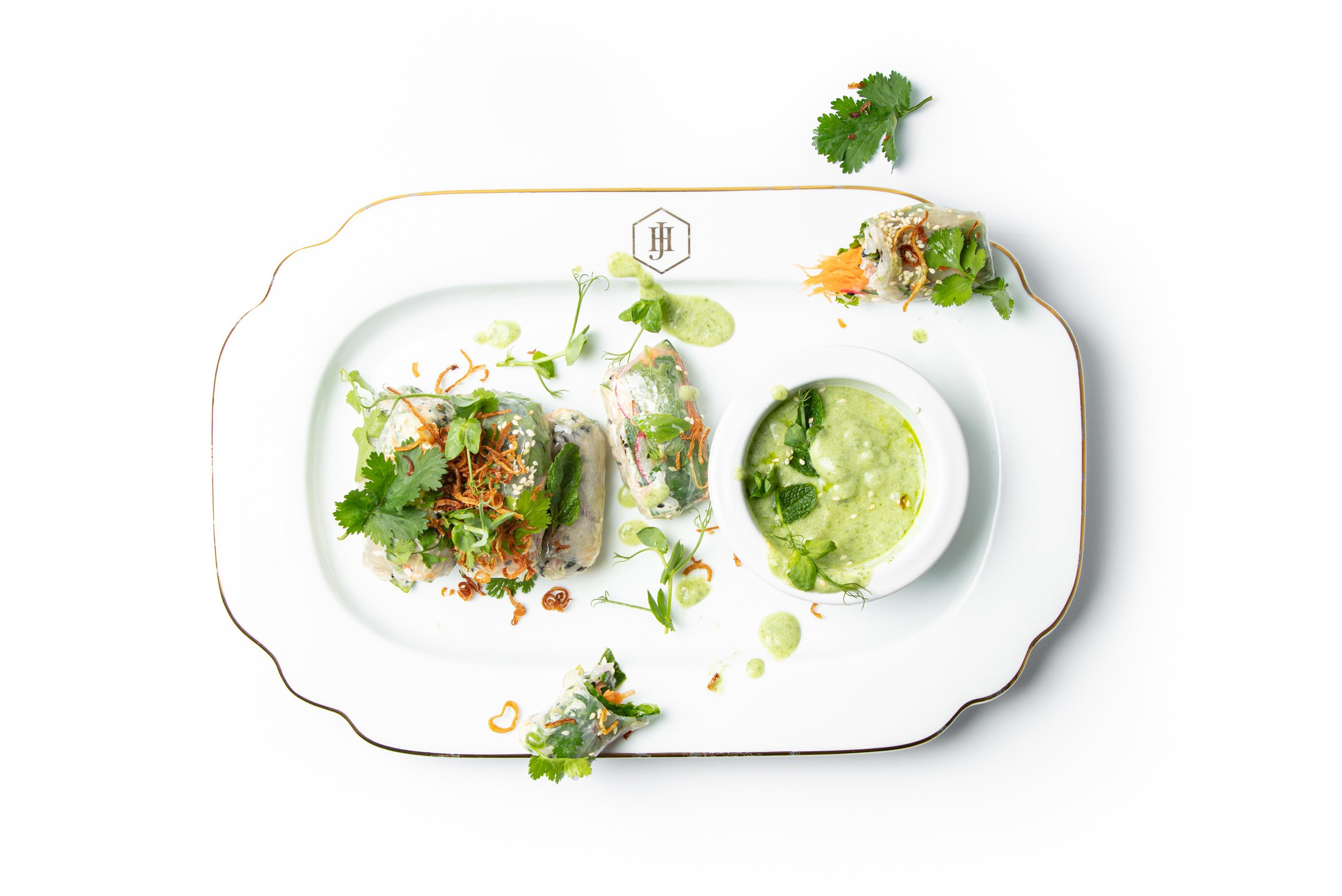 Pour 500 ml water in a pan and heat to just before boiling. Remove from the heat and carefully dip on rice paper in the water for 5 seconds. Take out and place flat on your work surface. Repeat with four more wrappers. Place a teaspoon of rice in the centre of a wrapper and top with cucumber ribbons, sliced radishes, pickled carrots, basil, mint and coriander. Fold one part of the rice paper wrapper over the length of the filling. Then, fold the two opposite edges of the wrapper over the width of the filling. Continue to roll the wrapper until closed. Brush with a little sesame oil and place on a serving plate. Repeat this process with the rest of the dipped wrappers and then repeat with rest of ingredients. Garnish with sesame seeds, coriander, mint, pea shoots and crispy fried onions.