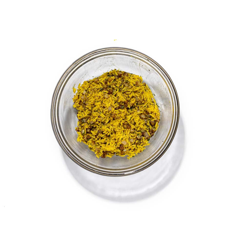 Cook the rice according to the supplier’s instructions, adding the turmeric powder to the water. Once cooked, drain the rice and reserve until needed.