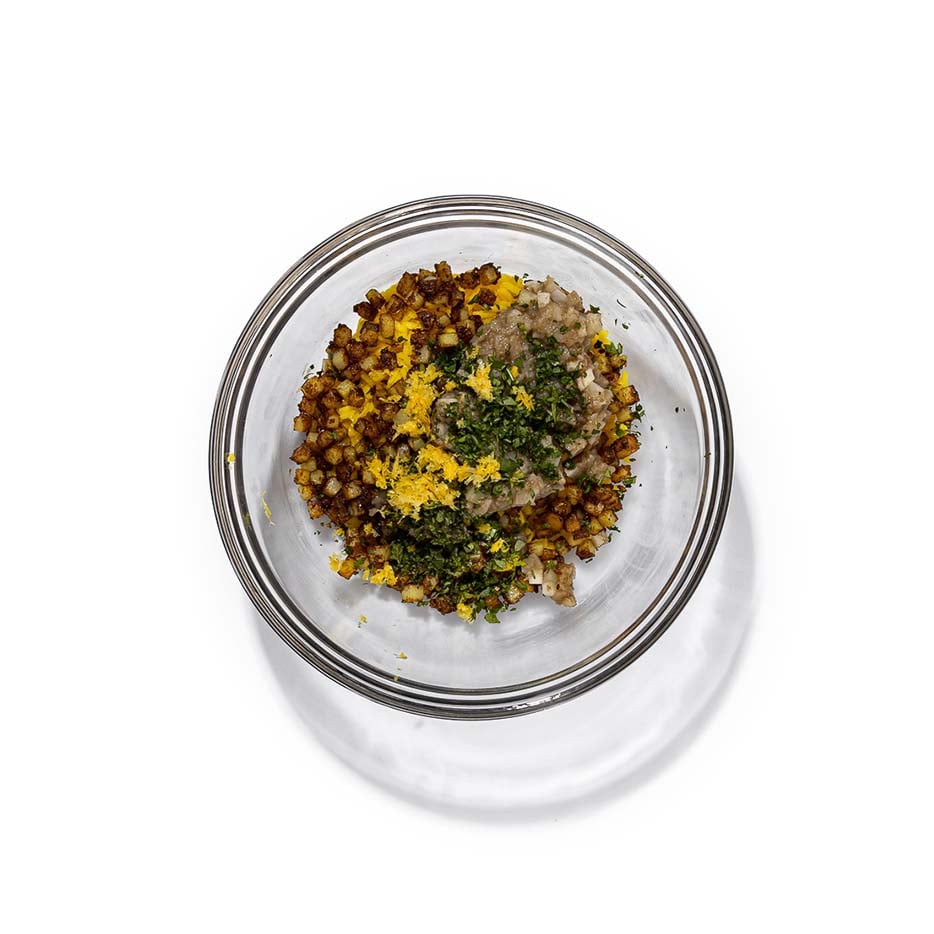 Finely chop the mint and coriander. Place the panko breadcrumbs in a blender, and blend until fine breadcrumbs have formed. Decant the breadcrumbs into a medium bowl. In another medium bowl, add the cooked rice with turmeric, aubergine, potatoes, mint, coriander and 30ml of blended breadcrumbs. Mix everything together until well-combined.
