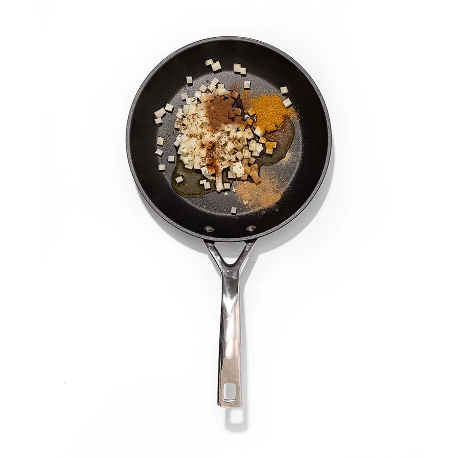 Peel the potatoes and cut into small cubes. Place the olive oil in a medium pan and add the potatoes, ground cinnamon, ground cardamom, chilli powder, curry powder, cumin and ground ginger, and sauté until cooked and crispy. Remove the potatoes from the pan and keep until needed.