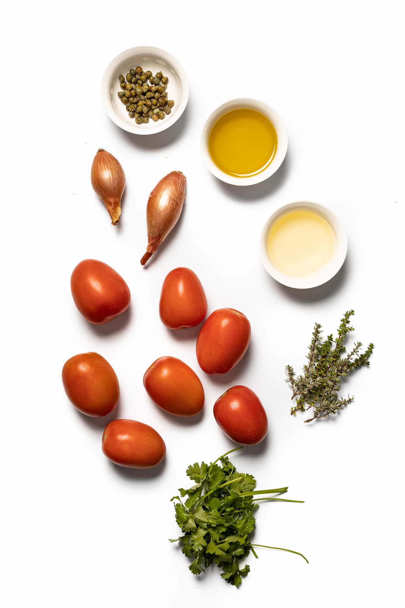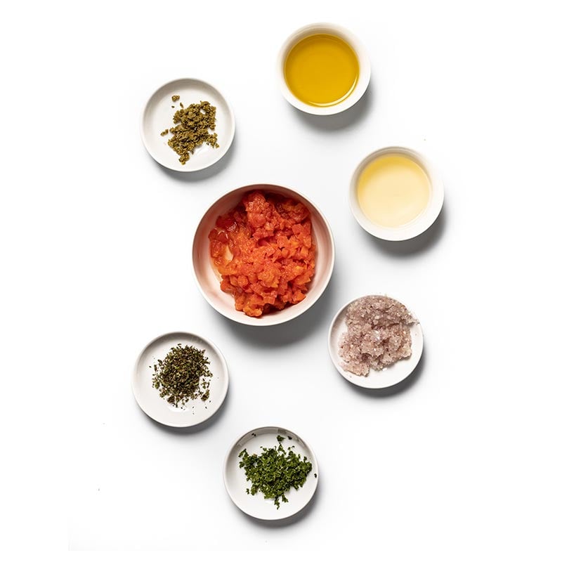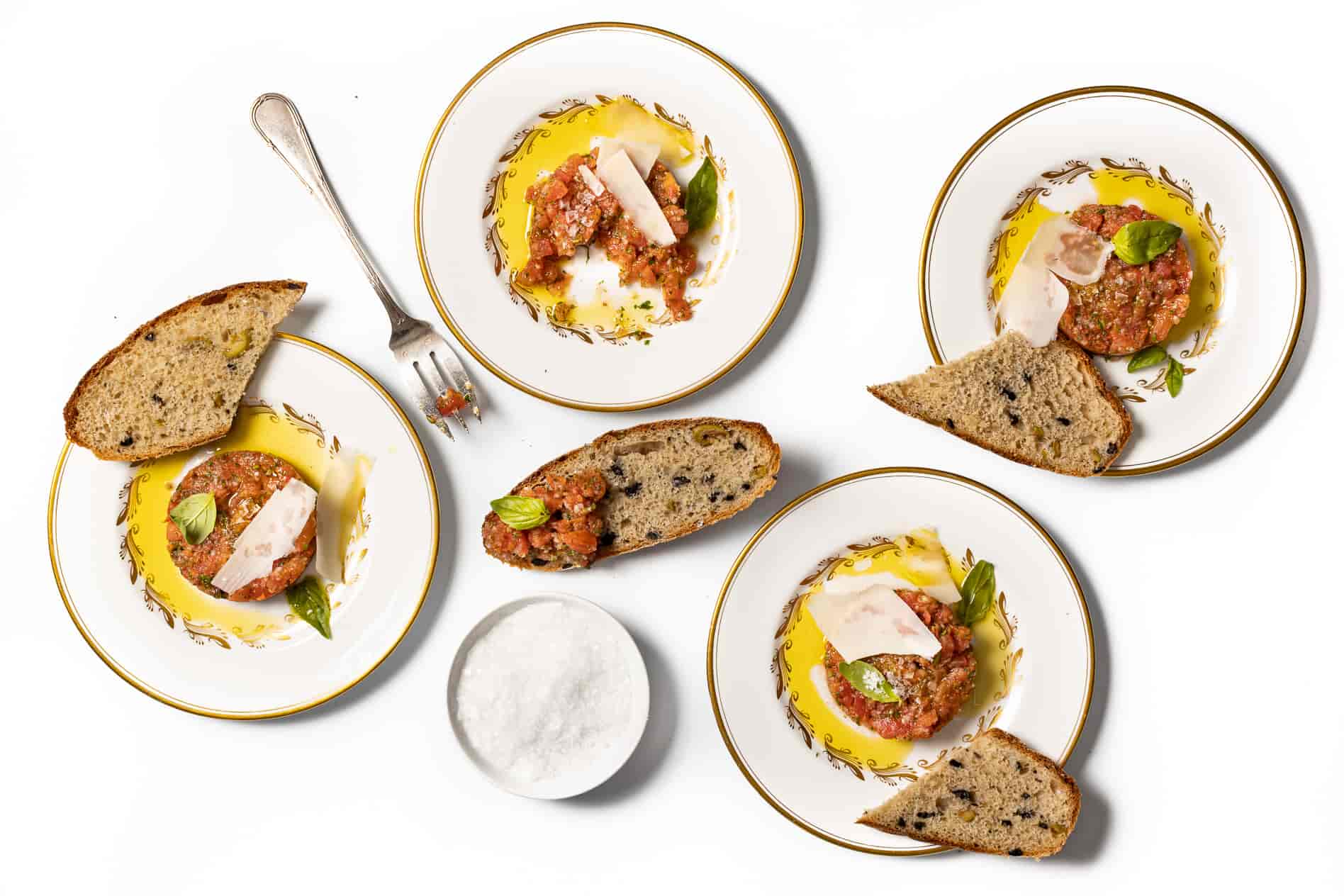 The moment I decided to really start exploring plant-based cooking, I knew I wasn’t going to bend over backwards to make mushrooms taste like grilled steak or pumpkin like shellfish – not when there’s such a wonderful spectrum of flavour to explore in the vegetable world. I’d rather enjoy vegetables for what they are than try to force them to be something they’re not… with the exception of this tomato tartare! But I’m proud to say that there’s nothing adulterated about this fully plant-based delight – no unnecessary flavourants – just tomato instead of steak. The omission of steak means this tartare is deliciously light, which makes for the perfect starter, along with a freshly baked olive bread. I know what I’m making (again) this weekend.