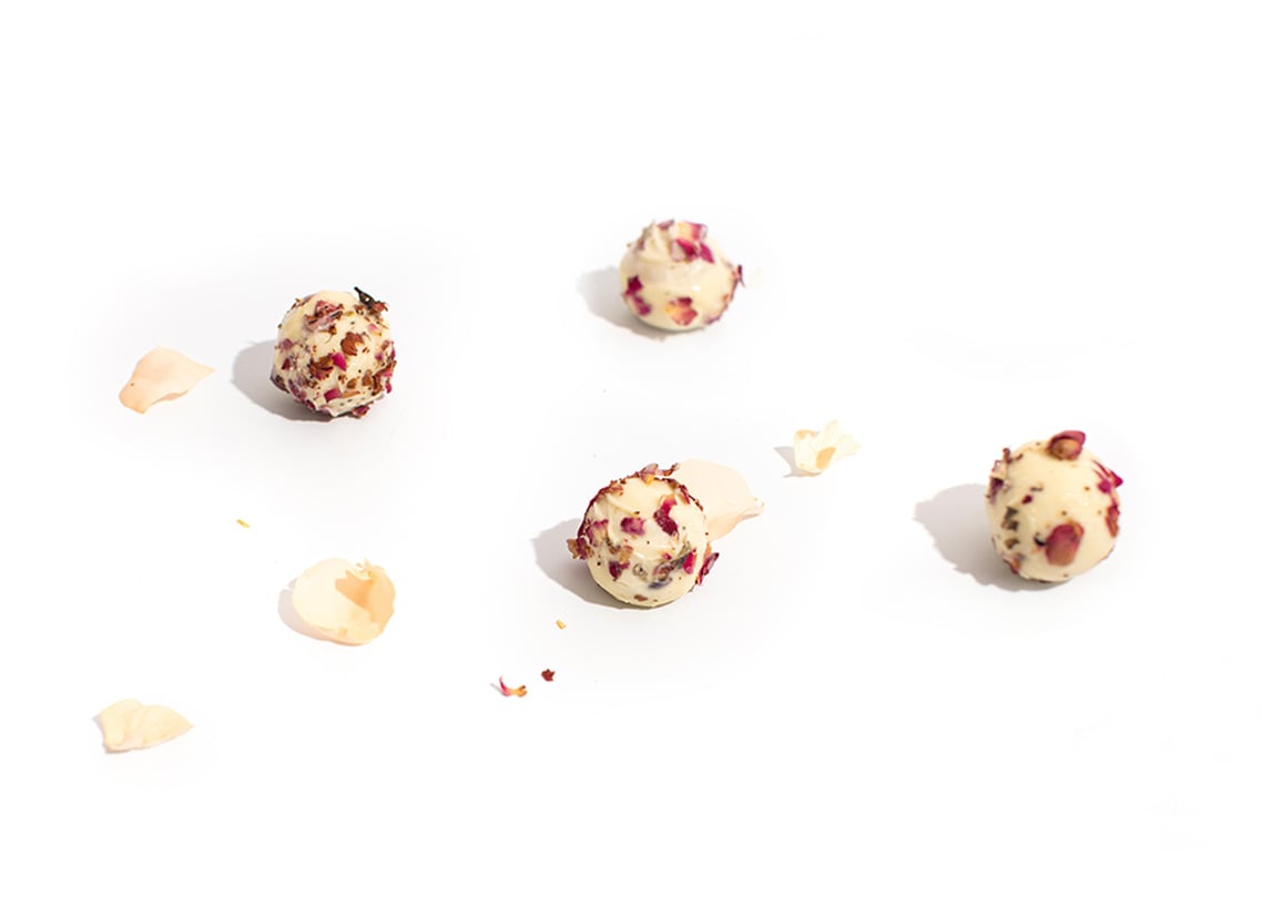 Melt the white chocolate in the microwave or over a double boiler, ensuring you stir with a silicone spatula every 40 seconds to avoid the chocolate from burning. Once the chocolate has melted, dip the rice spheres inside the chocolate using a toothpick and roll into the dried rose petals while the chocolate is stell melted. The chocolate should not be too hot when dipping.