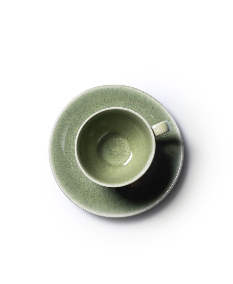 The rich green glaze with organic speckled detailing creates a beautifully artistic finish, while the perfectly sized saucer adds elegance to every pour. A must-have for those who appreciate the art of slow sipping.
