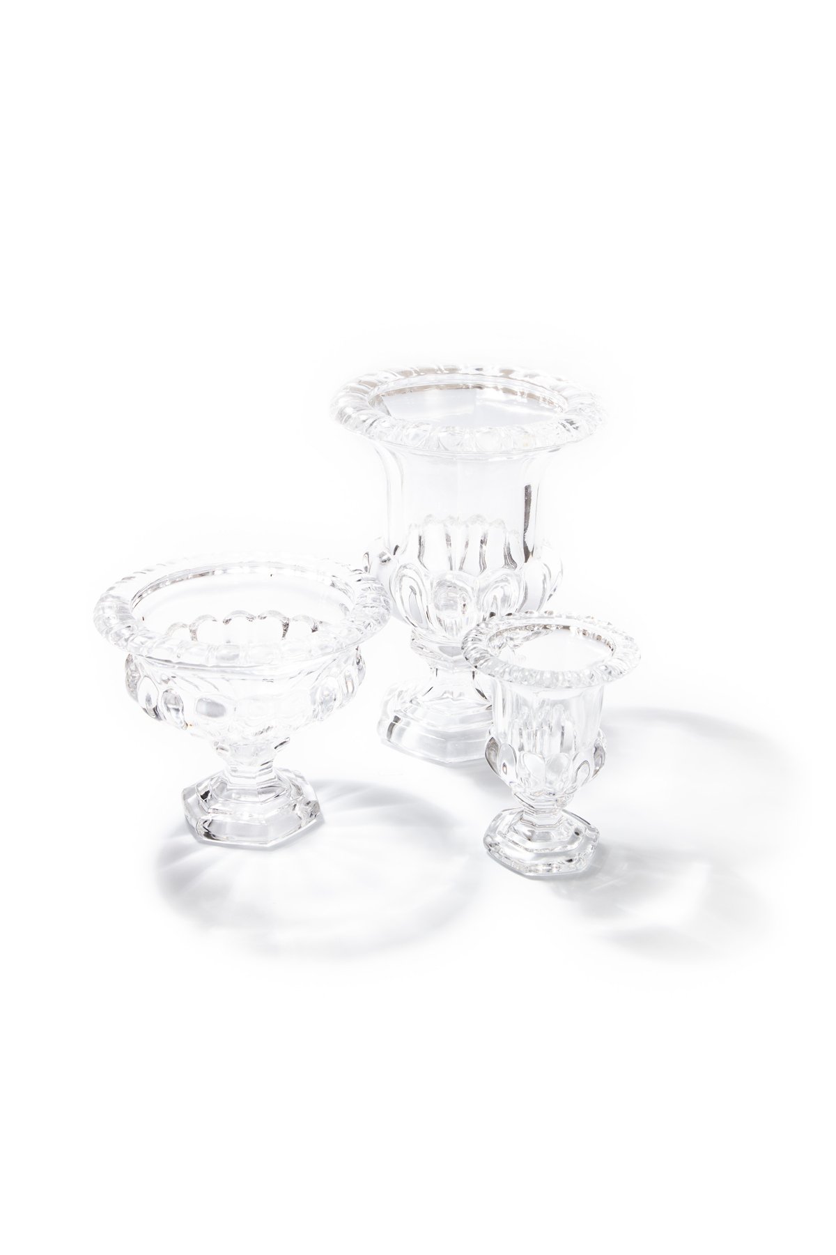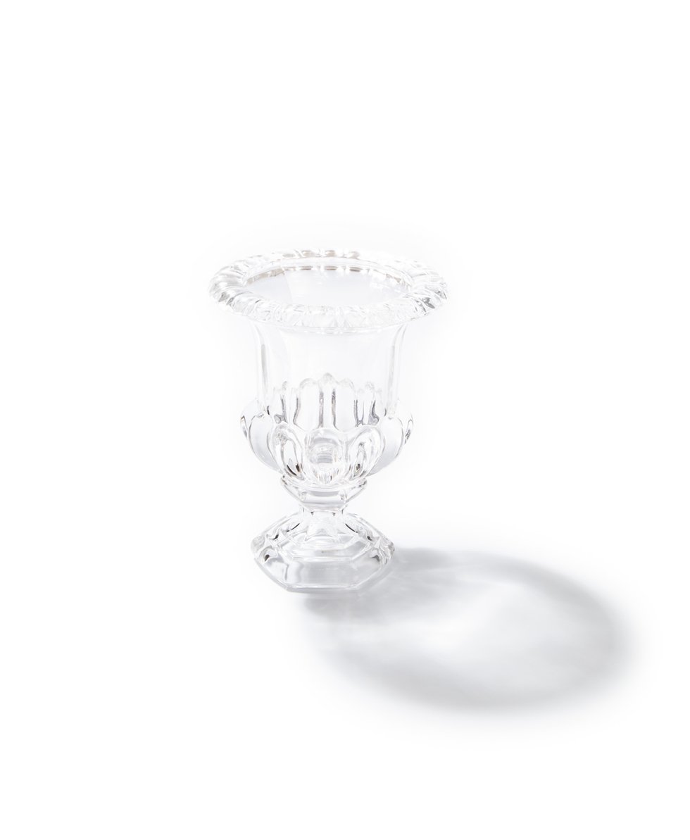 A beautiful and heavy crystal urn vase with a six-sided base and decorative detail on the side and rim.