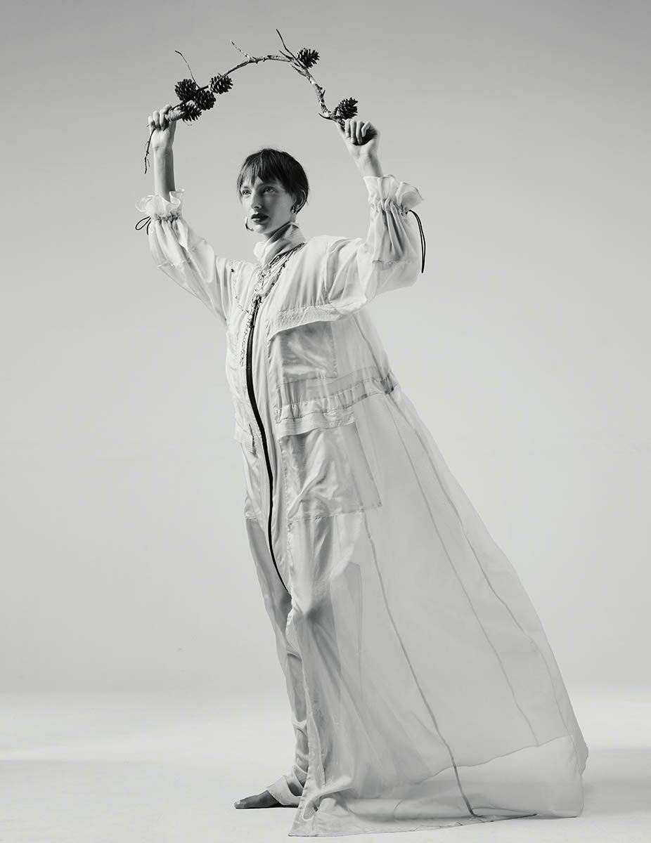 It can be difficult but I luckily get placed in shoots and situations where I can have a say in things. So if I see that something is too busy I’ll intervene and say, “ok, let’s tone it down.” I love busy things and shots but it needs to be done right as well, and especially with beauty shots I think less is more. That’s what we did so beautifully here, you have some craziness in the shoot but also some really beautiful moments with the silhouettes we’ve created with the lights in the studio, and the garments as well. For example, the shot of the model in the cocoon was such a beautiful, surreal, still moment.