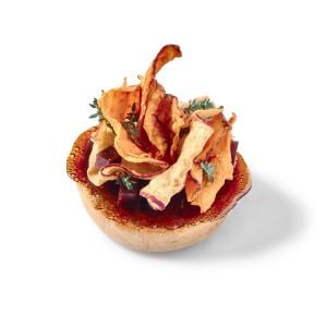 Top each tart with a few blocks of plum jelly, then place a caramel glass lid on top. Finish with more plum jelly cubes, root vegetable crisps, and fresh thyme leaves.