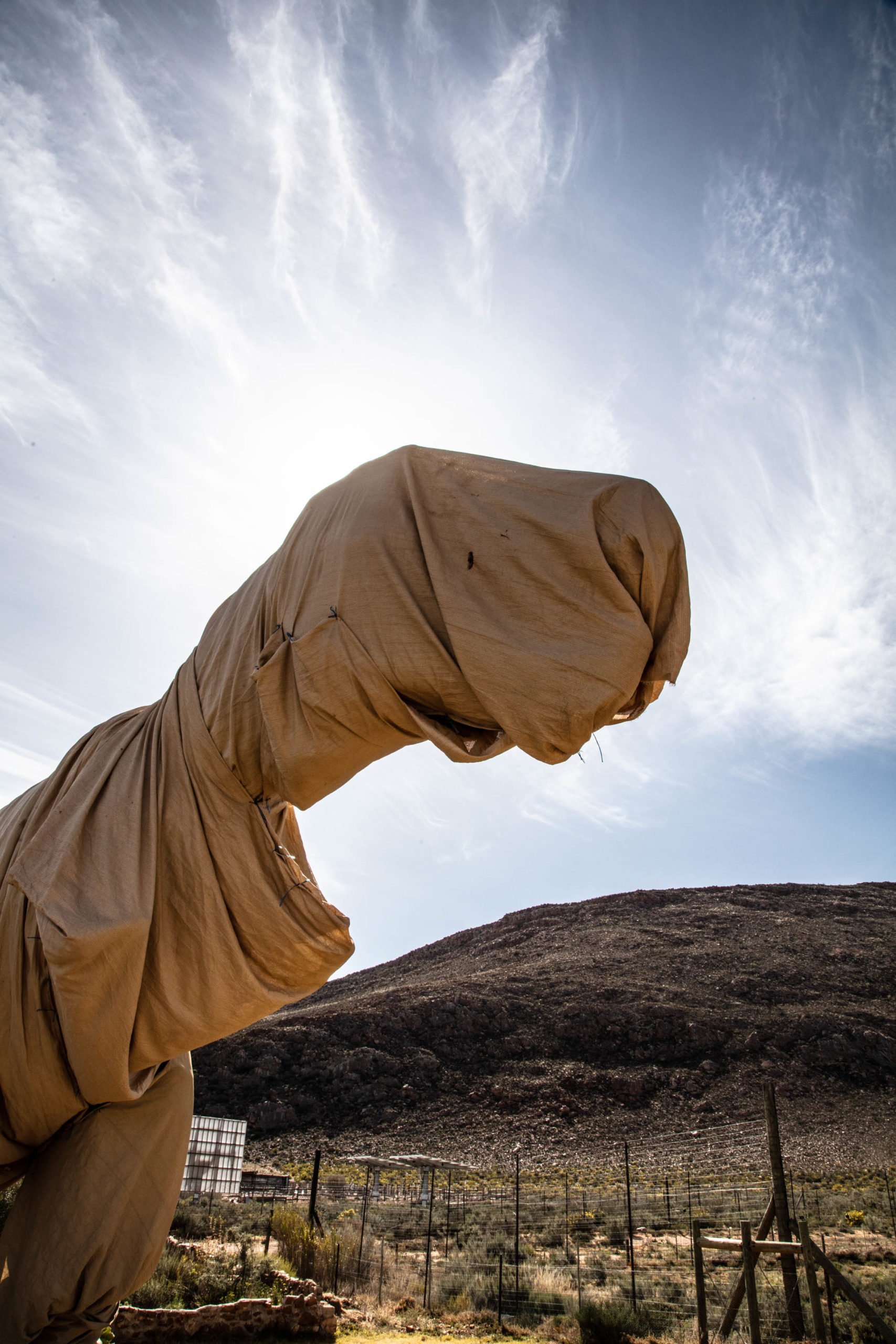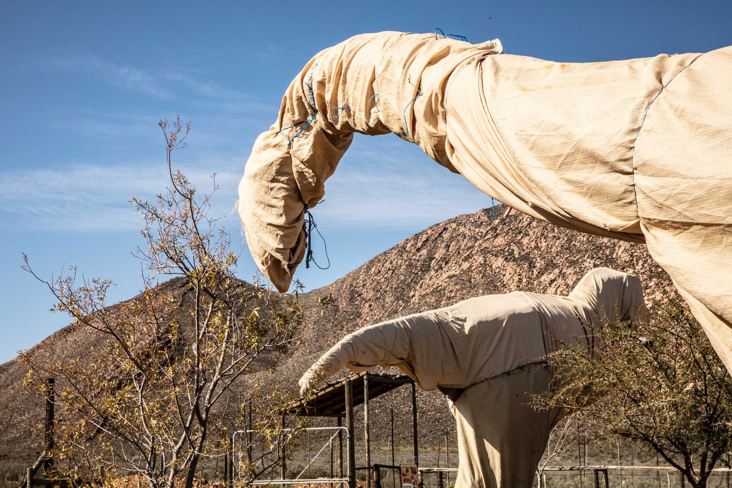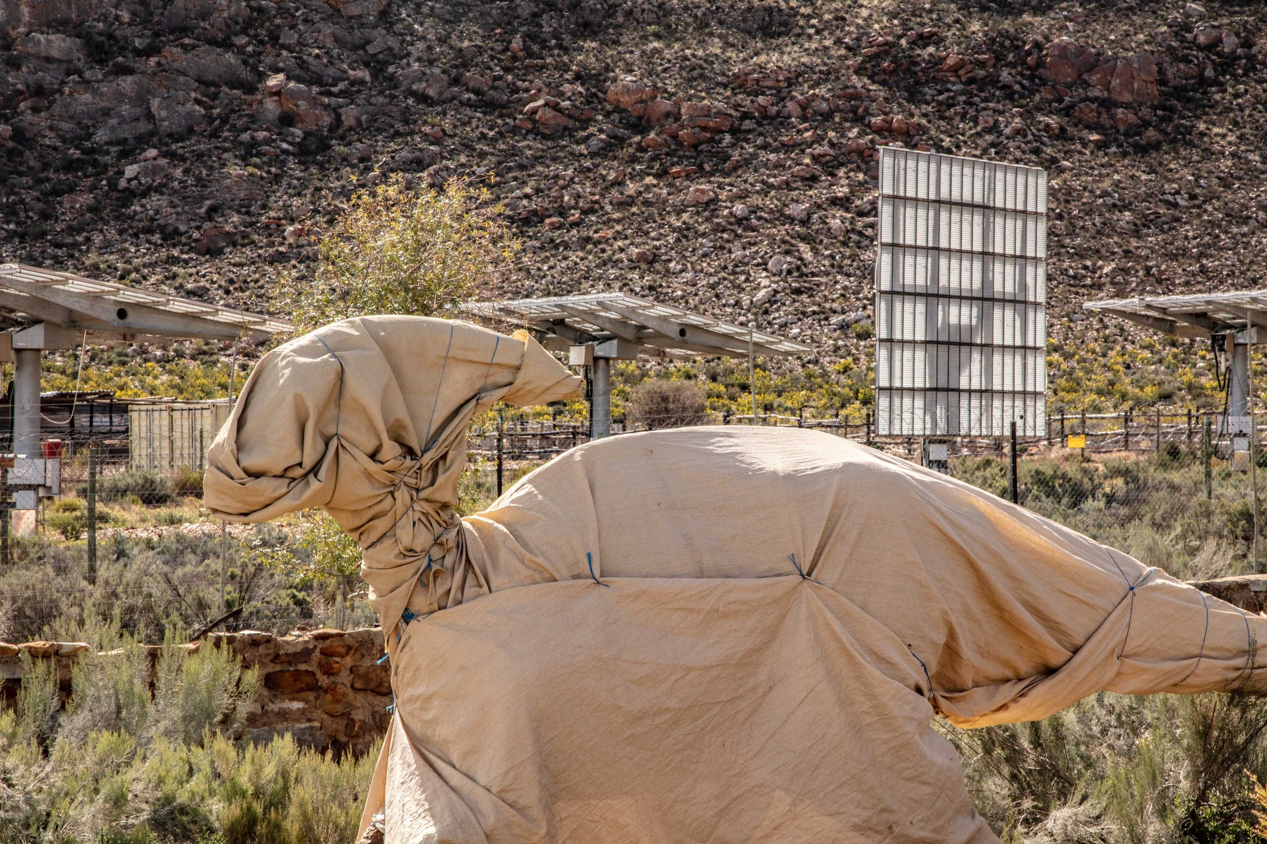 Travelling trans Karoo mid-August, we were suddenly met by a truly unexpected sight. Right across from Aquila Game Reserve’s main entrance there loomed a mixed herd of dinosaurs covered in large, canvas sheets, strolling ghostlike through a valley dappled with solar panels and weather equipment. The whole spectacle seemed like something out of a 1980s Spielberg film. Had this been a misty night, it would have completed the picture perfectly.