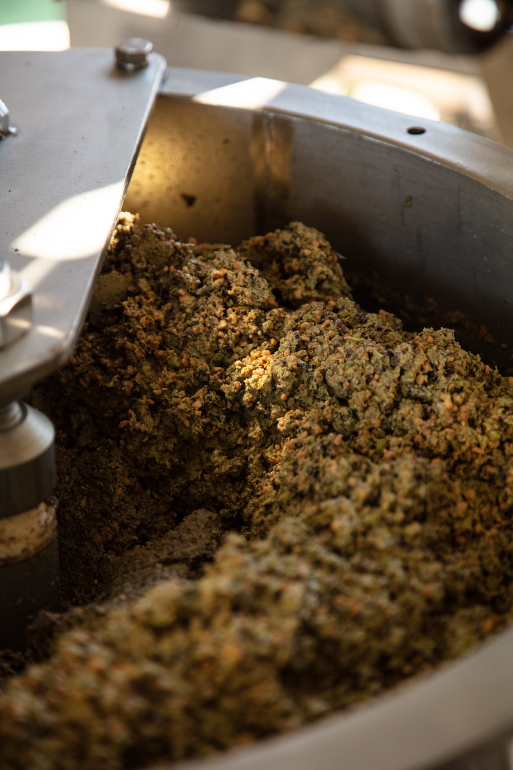 During this second step in the process, the olives are ground into a paste, pips and all, which tears down the plant cells that harbour the oils.