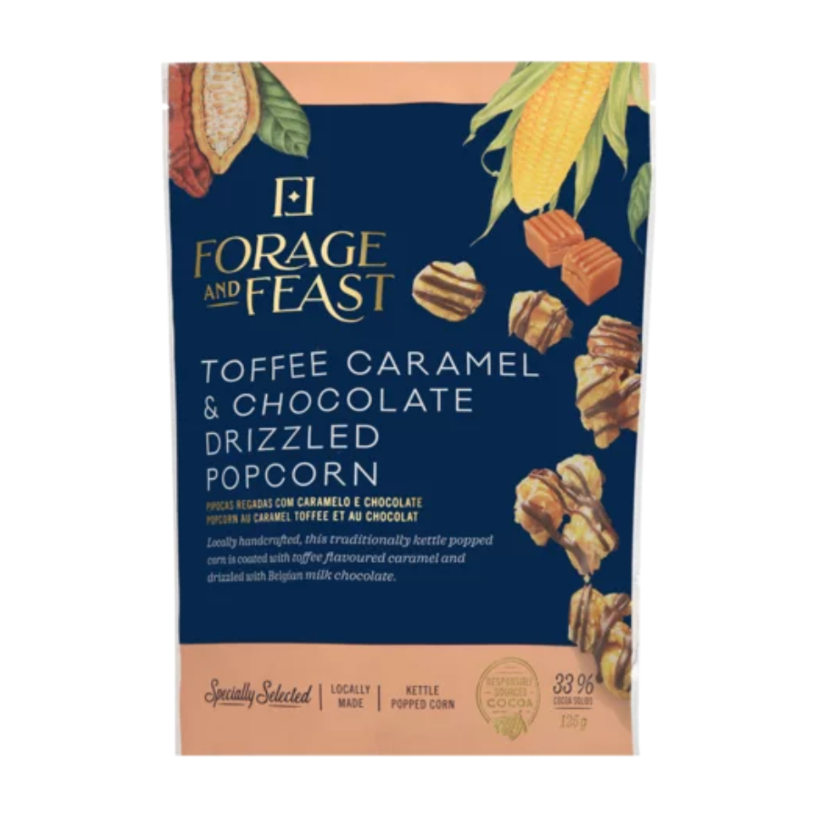 Locally handcrafted, this traditionally kettle popped corn is coated with toffee-flavoured caramel and drizzled with