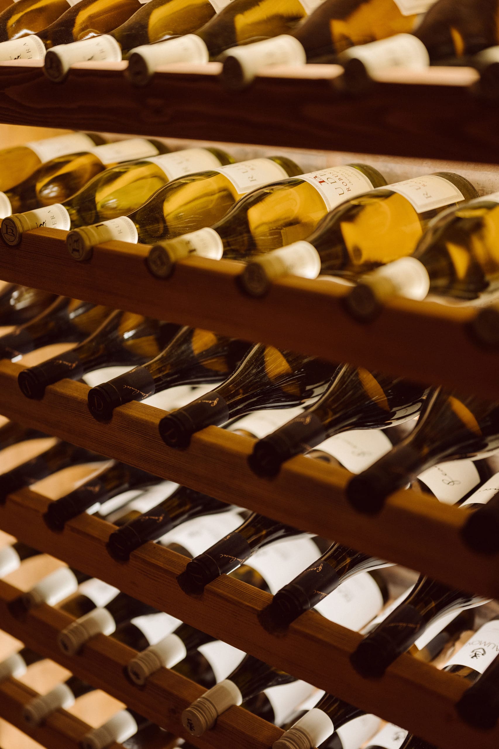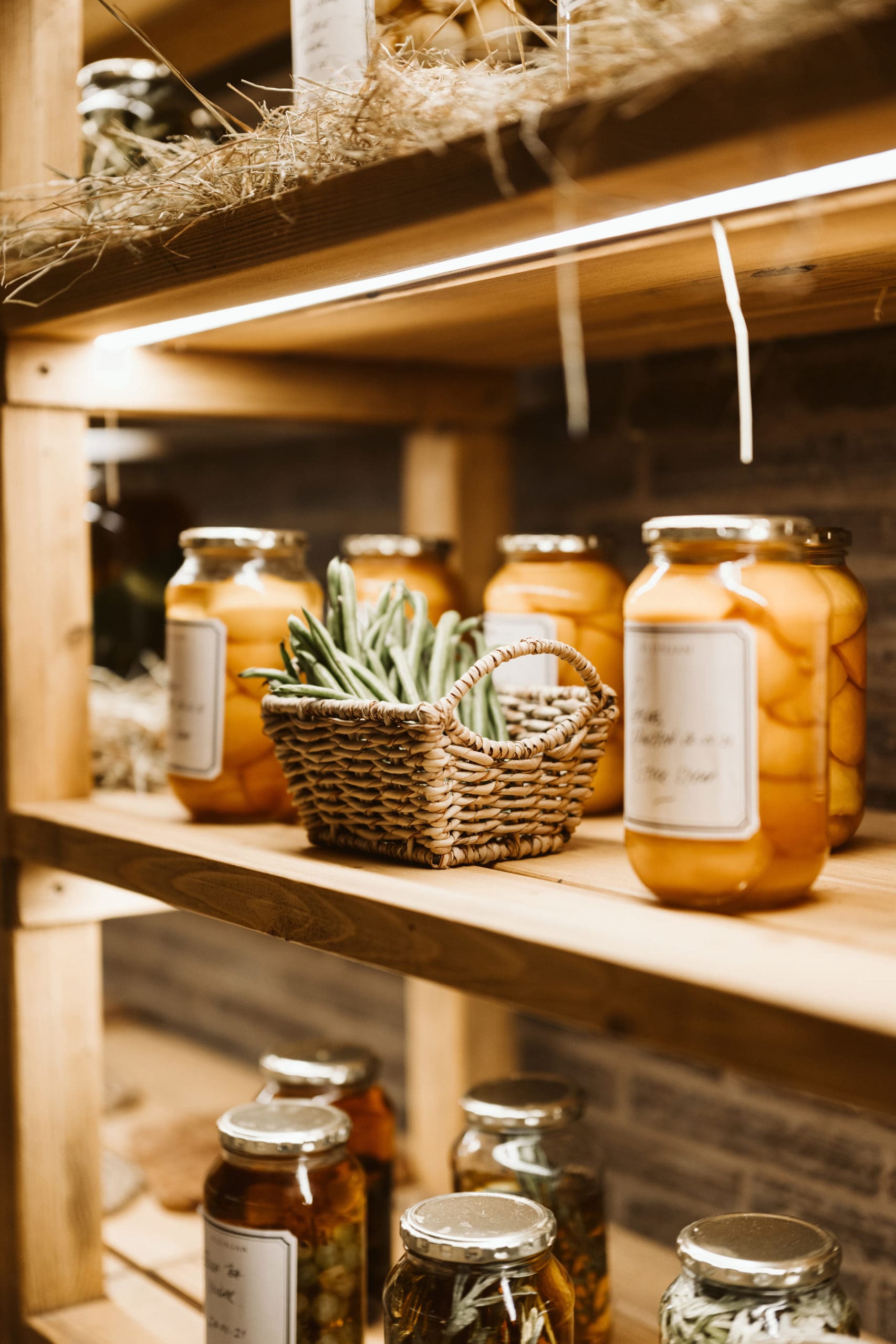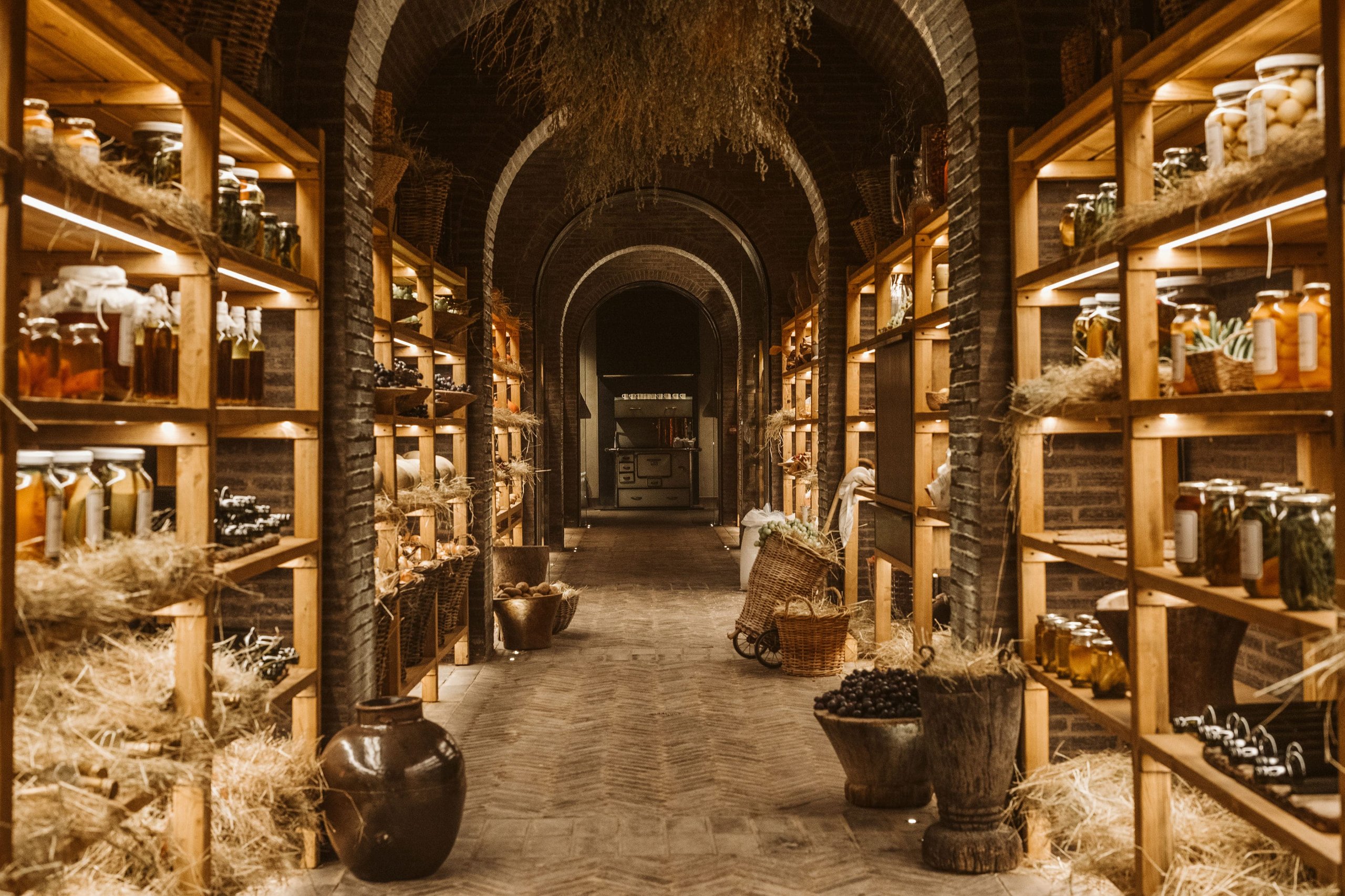 The Klein JAN root cellar is located four metres below ground, and is accessed through an almost hidden door in the side of a plaasdam alongside the iconic, hundred-year-old Boscia House. At the bottom of a helical staircase lined with a curtain of water infused with petrichor (the smell of rain falling on dry earth), you enter a 20-metre-long, arched hallway lined with shelves. The concept of this underground root cellar dates back to the 18th century — a time before electrical refrigeration — which was really an incredible concept for that time. In this climate-controlled space, the humidity averages 80% while the temperature remains at a steady 5 °C, no matter the temperature outside.