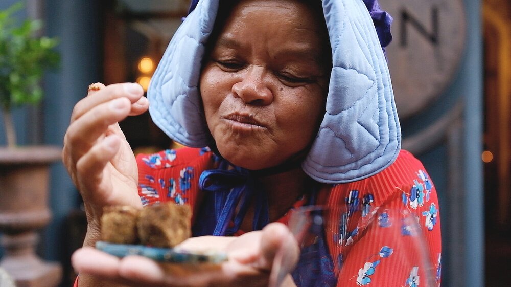 Although we had shown Poppie some pictures of the food that Jan serves at his restaurant we had no idea if she would be willing to try all the small courses that she described as ‘blomme’ from the pictures. As we sat down, we could still see traces of Poppie’s tiredness in her face. Water was poured, and out came Jan. He greeted the ‘Madame’ in Afrikaans gave her a big hug and suddenly Poppie was back! He explained that what she was about to experience was his version of some time-old South African recipes. That the dishes may look a little different to what she is used to. With each course, Jan described fond food memories and where she could, Poppie related her stories to the food of her childhood. Biltong lamingtons, burnt pap en chakalaka, bobotie, Rooibos beef tea, jelly and custard, and good old Spanspek! As we ate the beautiful and delicate dishes, ‘Suikerbos, Ek Wil Jou Hê’ playing softly in the background, we could see Poppie settling comfortably into this foreign but familiar sense of home.